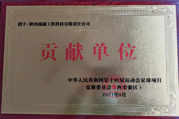 2021年9月,我公司被十四屆運(yùn)動(dòng)會(huì)足球項(xiàng)目競賽委員會(huì)(西安賽區(qū))授予“貢獻(xiàn)單位”獎(jiǎng)。
